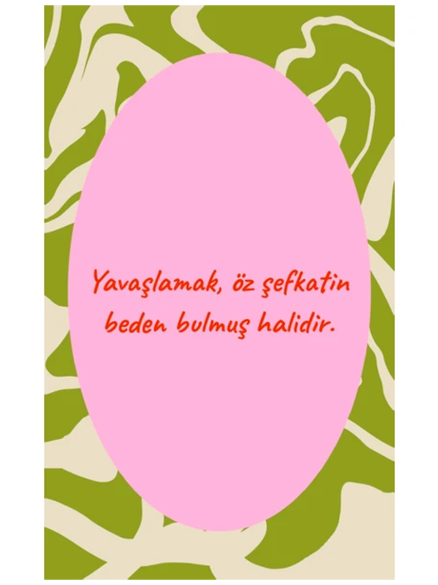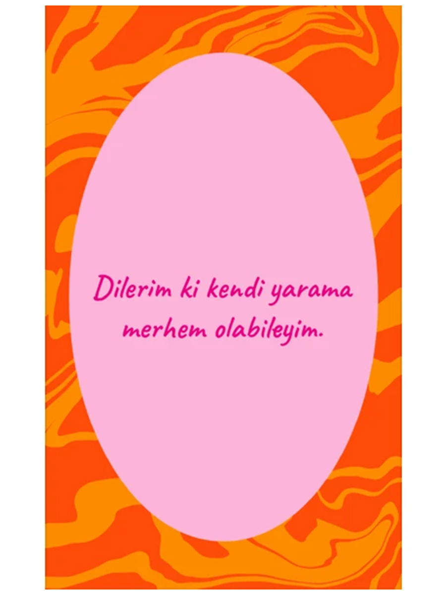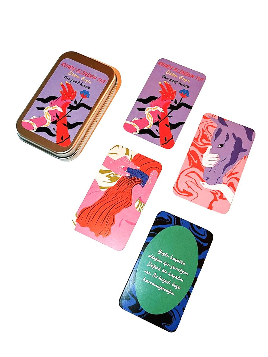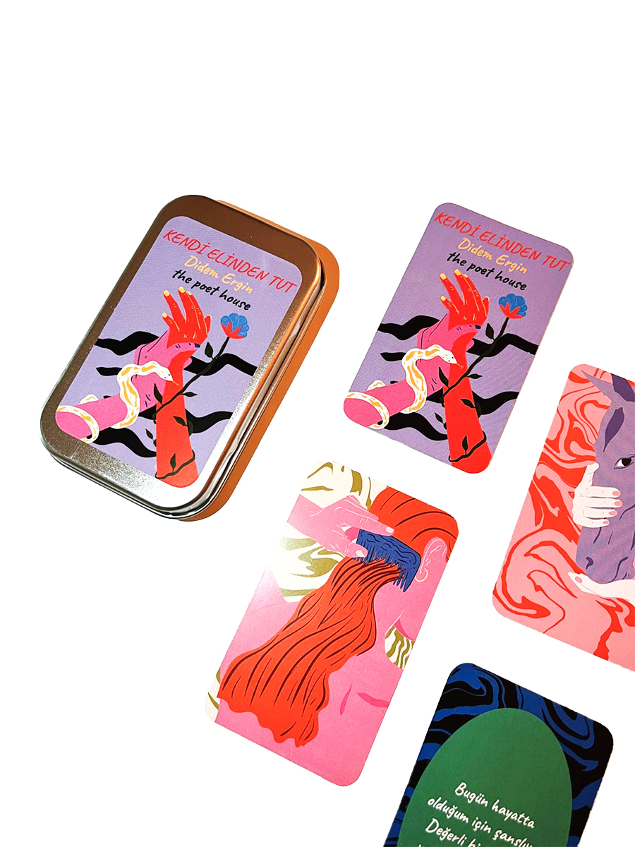 Bu eserin cümlelerini de bir araya getiren Didem Ergin şöyle bahsediyor: 32 karttan oluşan bu kart destesi, zor anlarınızda kendinize nazik bir destek sunmak ve hayatın tüm süreçlerinde yanınızda olduğunu hissettirmek için bir araya geldi. Güne başlarken, zor bir duyguyla karşılaştığınızda ya da sadece bir an durup soluklanmak istediğiniz, Didem Ergin’in sözleri, İsmail Sertaç Yılmaz’ın çizimleriyle buluşarak size dost eli uzatıyor. Her bir kart, acılarınıza hassasiyetle bakabilmek ve kendinizle sevgi dolu bir bağ kurmak için davettir. Kartlardaki cümleler, şefkatin gücünü size hatırlatmak içim burada. Onlar, size “Her zaman yanındayım,” diyen içsel bir dosttur. Kendinize gösterdiğiniz şefkat, sadece sizi değil çevrenizi de dönüştürür. Şefkat, önce kendinize döndüğünüzde tüm dünyaya yayılan bir armağandır.